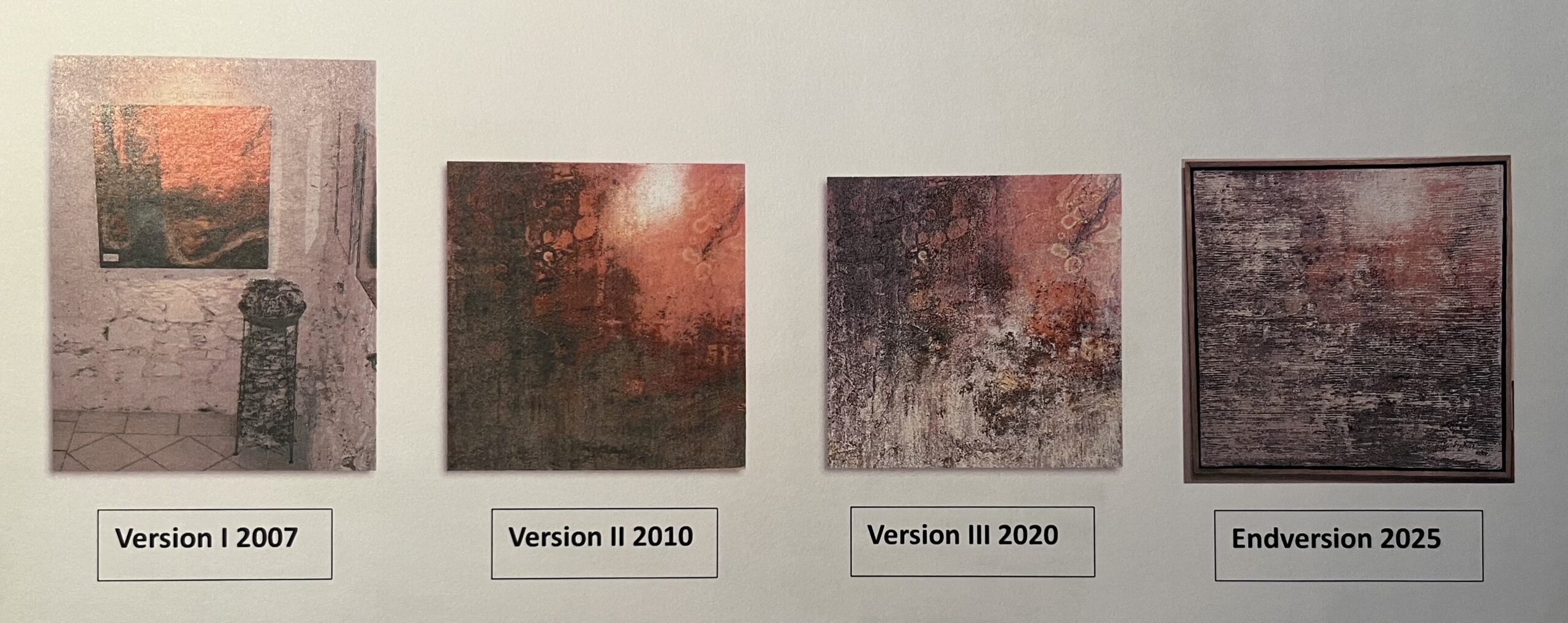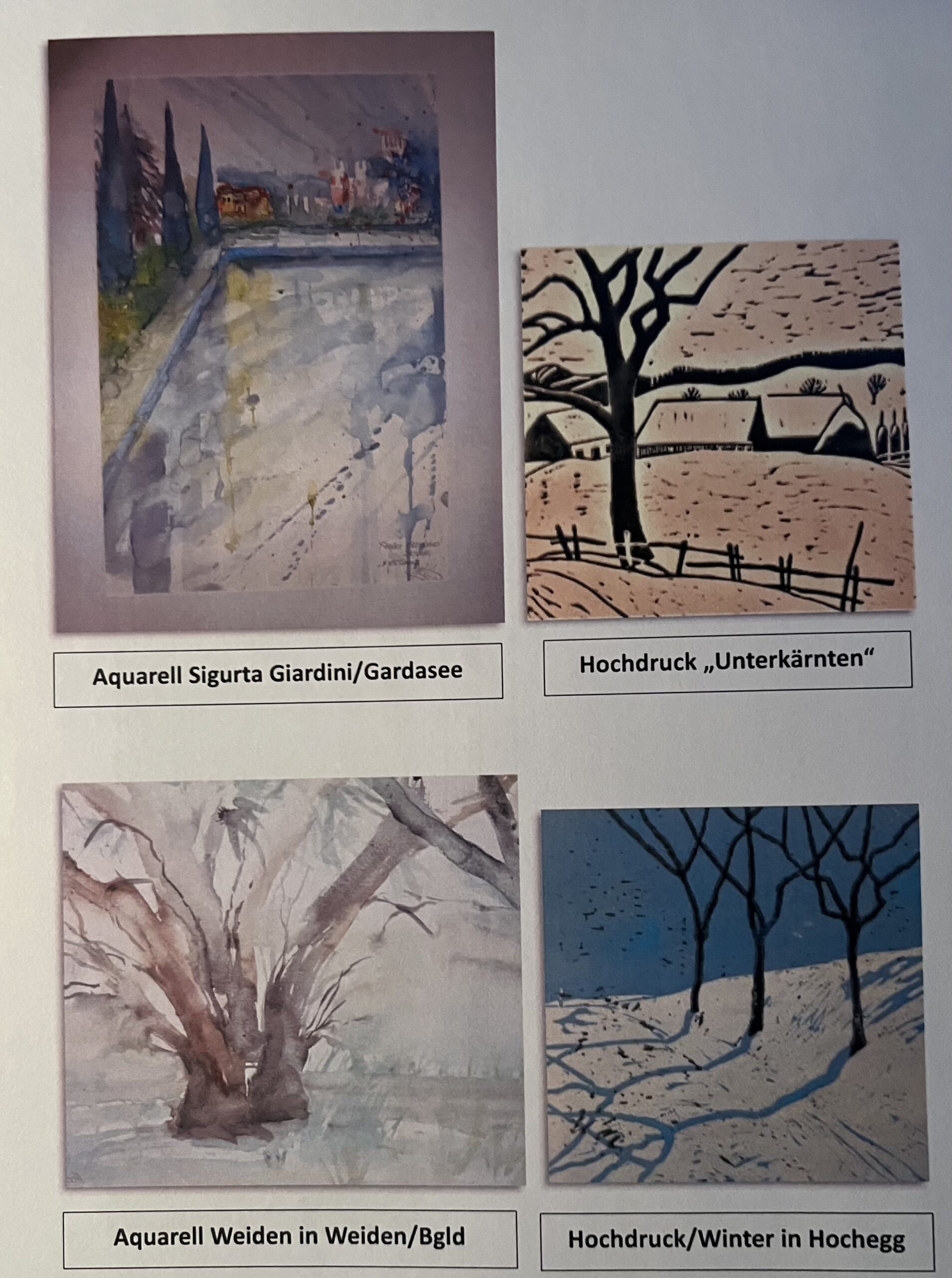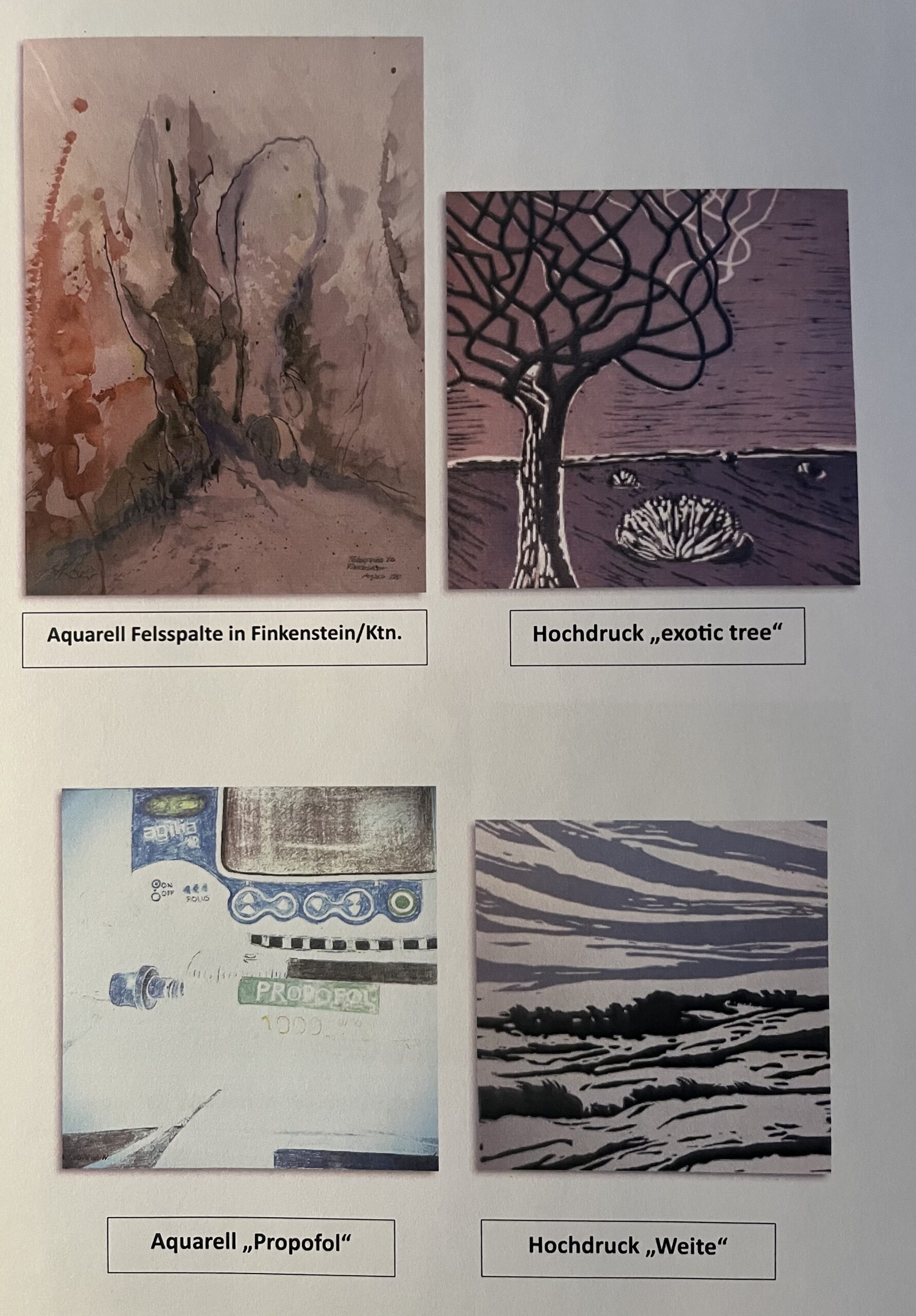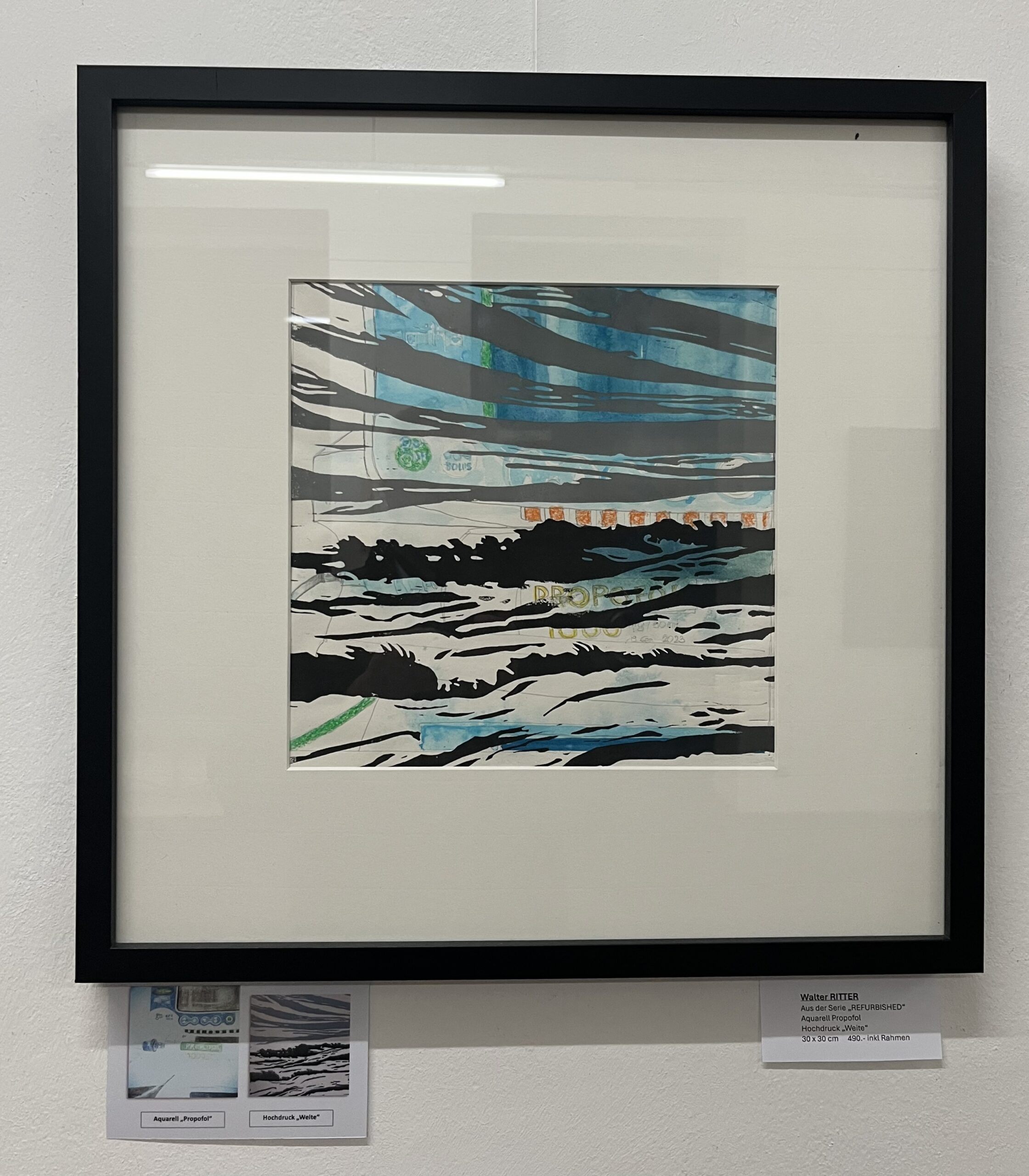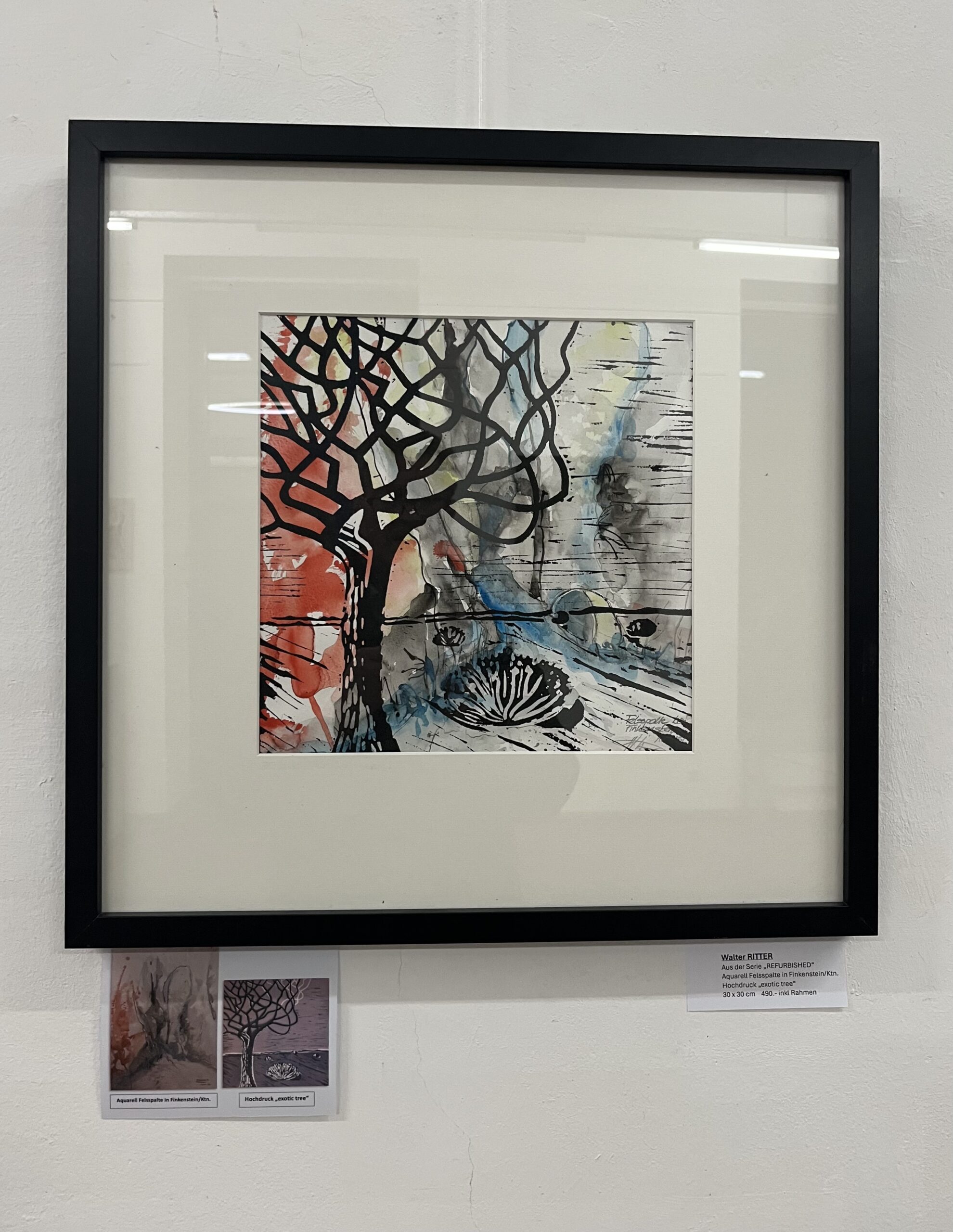 Der englische Begriff „refurbished“ wird für gebrauchte Produkte verwendet, die professionell überholt bzw. aufbereitet wurden, um anschließend wieder vermarktet zu werden. In diesem Falle wurden Aquarelle bzw. eine Arbeit in Mischtechnik mit Drucken bzw. durch Aufbringen von Strukturen verfremdet/verändert, wodurch Arbeiten in völlig neuer Qualität entstanden sind. Unter dem jeweiligen Bild findet sich eine entsprechende Information über den Entstehungsprozess.