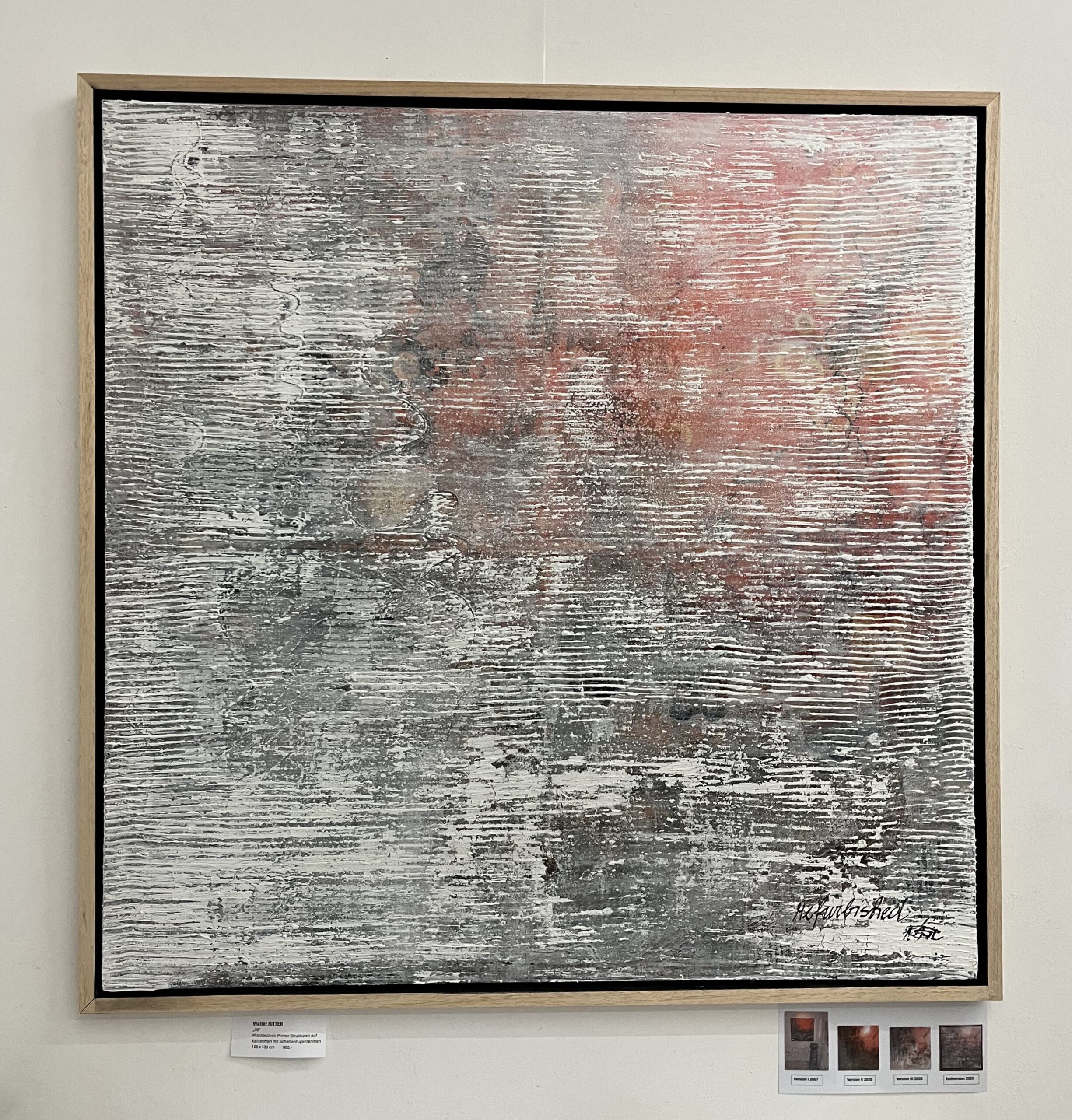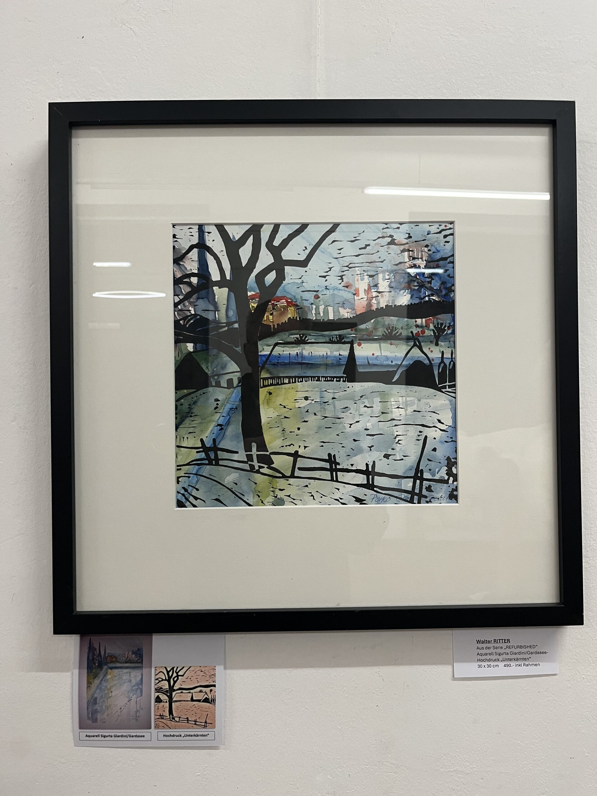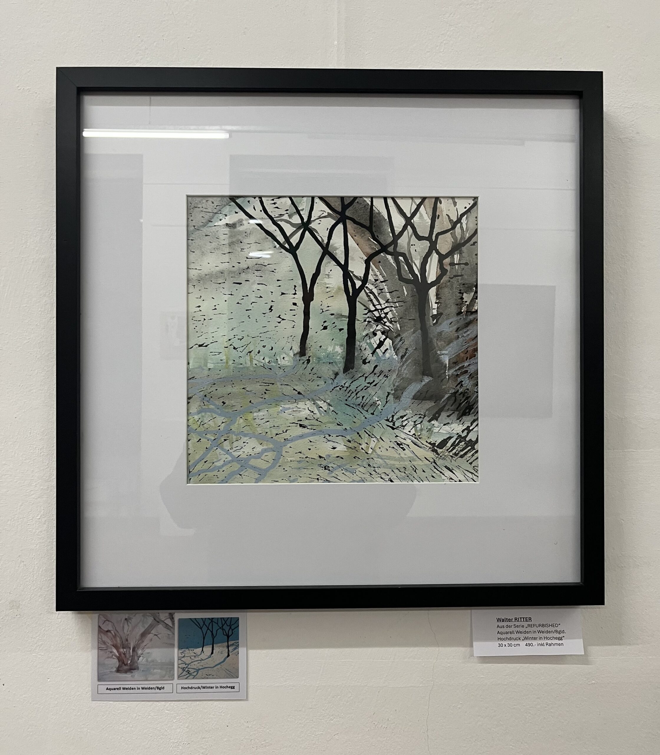 Die Aquarelle/Drucke (50x50cm inkl. Rahmen) sind um je 450.– zu erwerben, die Arbeit in Mischtechnik (104x104cm inkl. Schattenfugen-Rahmen) um 980,–)